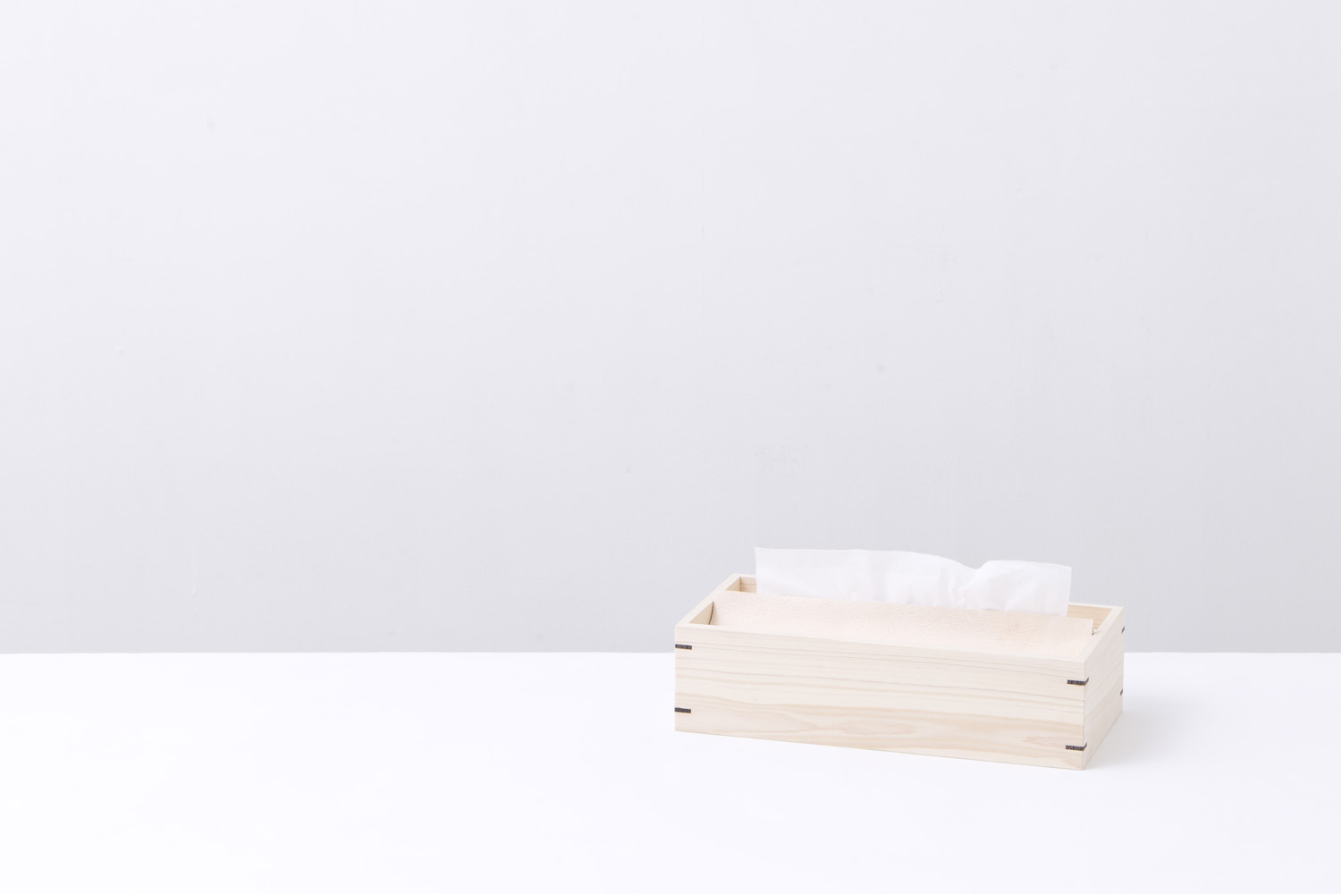 取出し口で鹿革がティッシュをホールドし、ホコリよけとしても機能しています。